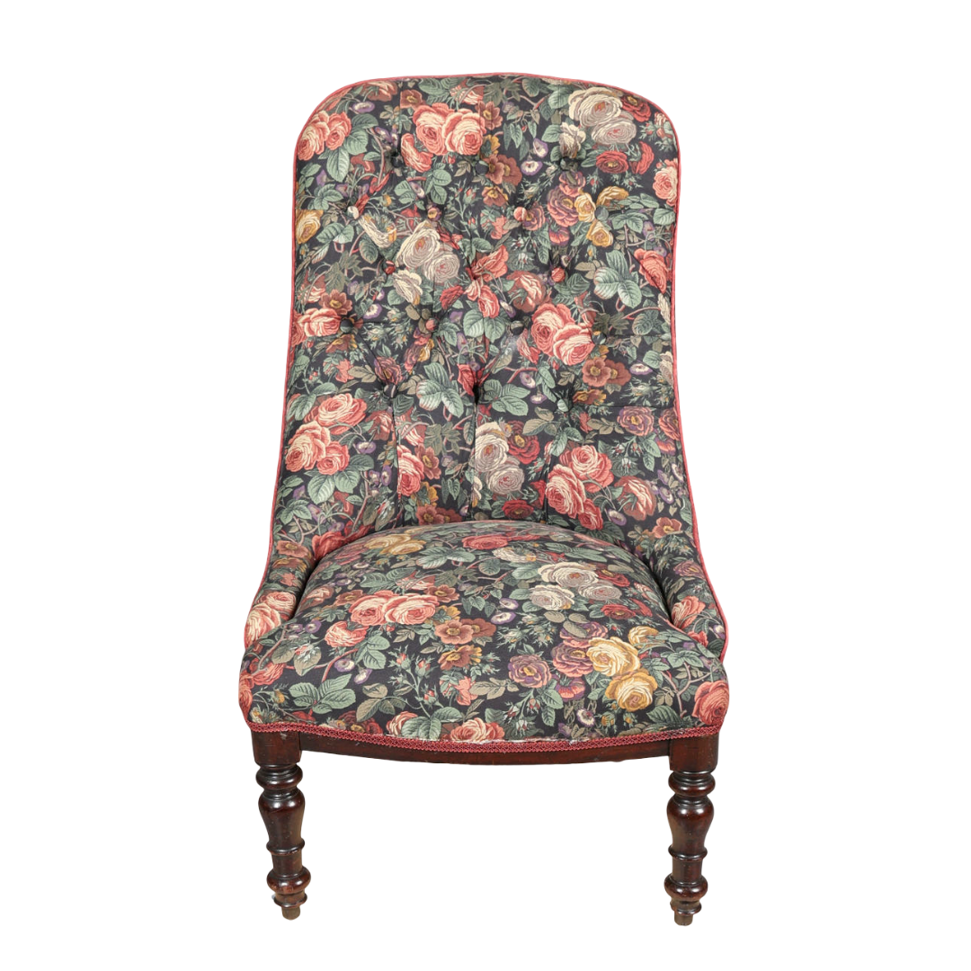 A Victorian Mahogany and Upholstered Nursing Chair, upholstered in a floral rose fabric and raised on a turned knopped legs, 89cm high.